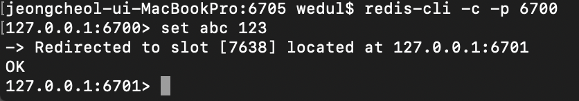 cluster모드에 redis 접속을 위해서는 -c 옵션을 달아서 실행시킨다.