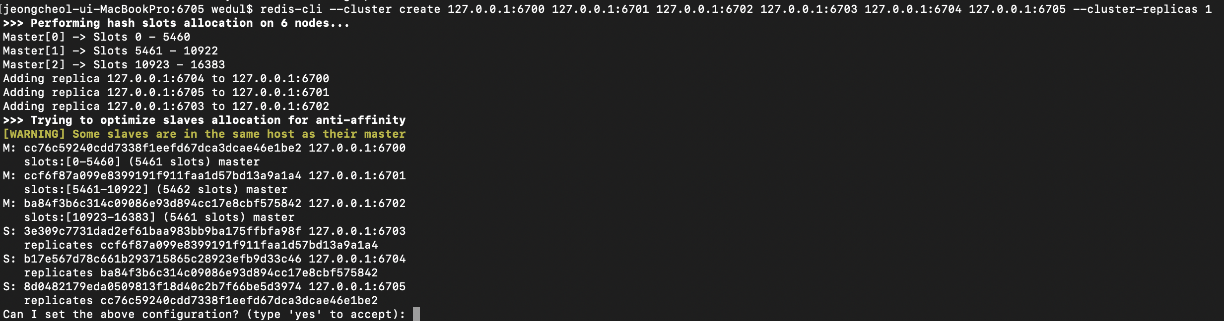 그러면 아래 보는것과 같이 서버가 3대 3대로 마스터와 슬레이브가 구성이되고 yes를 누르면 그에 맞게 클러스터가 구성된다.