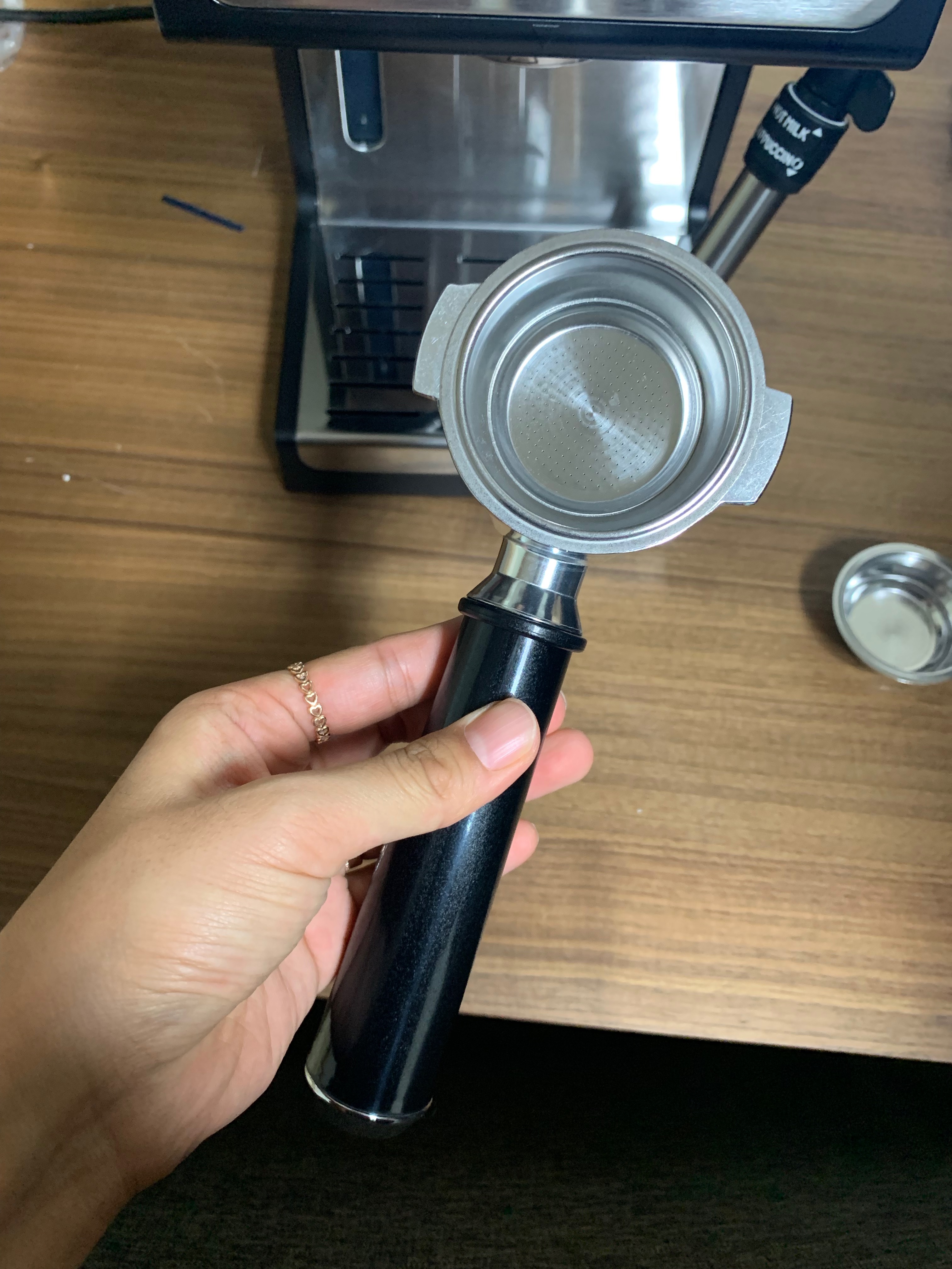 그라인더는 자동이고 왼쪽 다이얼로 원두 두께를 지정하고 앞에 있는 다이얼로 샷 개수를 정할 수 있다. 정해진 샷만큼 원두가 갈려서 나온다. 위에 뚜껑을 열고 원두를 넣으면 아래 통에 담겨서 나오는데 통을 뺄때 원두가루가 많이 흘러내리는건 좀 별루다.