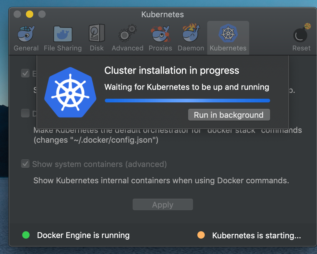 실습을 진행할 컴퓨터가 mac os이기 때문에 mac에서 설치하는 방법을 알아보자. 우선 docker에서 preference에 들어가면 kubernetes 탭이 존재한다. 여기서 아래와 같이 체크하고 Apply를 누르면 설정이 우선 완료된다.