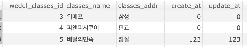wedul_classe 테이블의 데이터