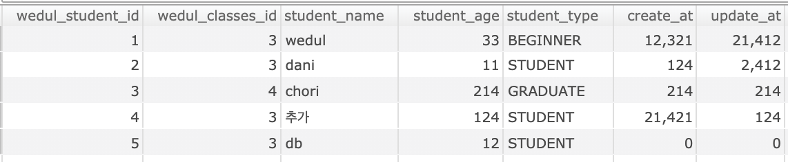 wedul_student 테이블의 데이터