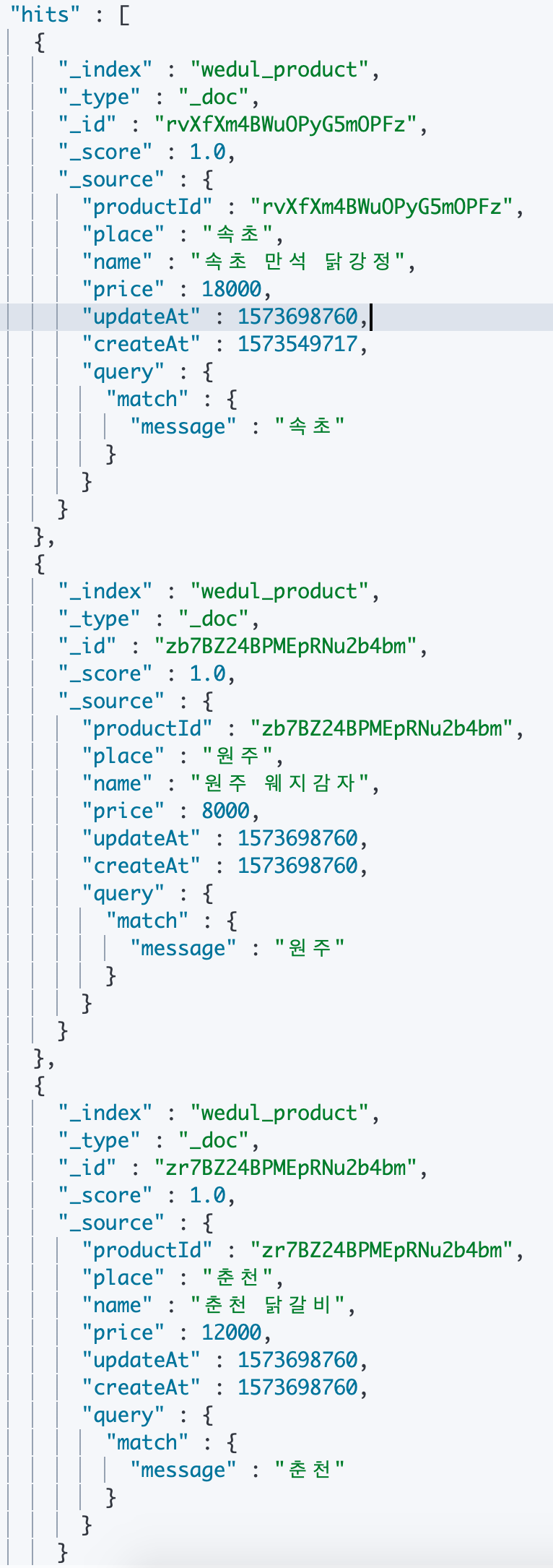 우선 index가 필요한데 간단하게 상품명과 지역 가격정보들을 가지고 있는 wedul_product 인덱스를 만들어 사용한다.