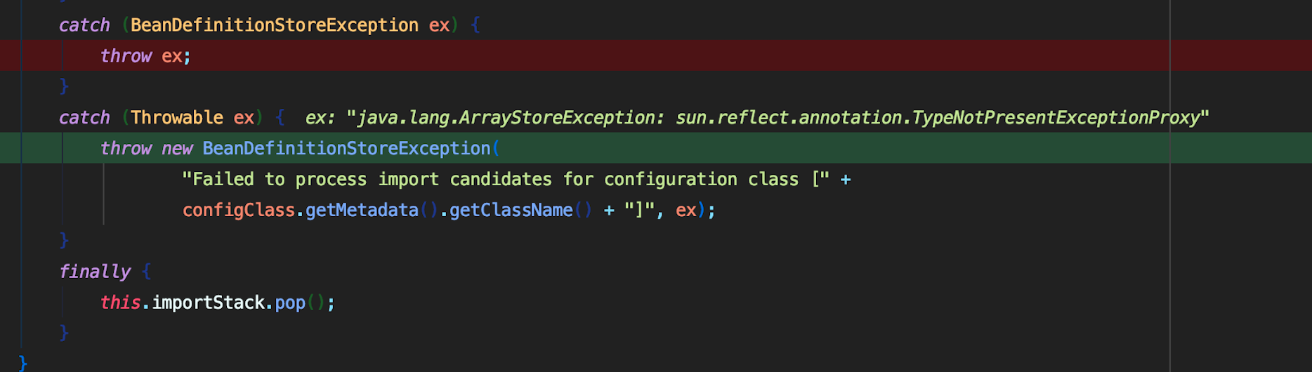 그로 인해 visitor를 통해 configuration class에 내부정보를 가져오다가 에러가 발생하게 되면 processImport에 에러가 전파되어 BeanDefinitionStoreExeption이 발생하면서 결국 application이 실행이 되지 않는 것이다.