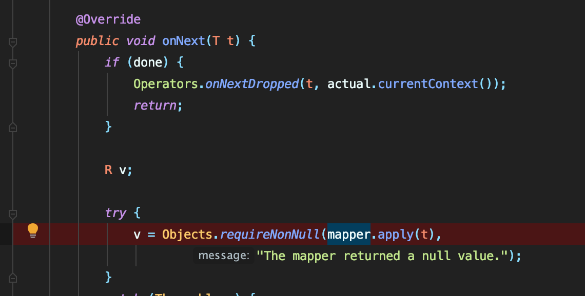 데이터가 subscribe return 되는 과정에서 mapper(Function)에 apply 되었을 때 반환되는 값이 null이게 되면 NPE를 내놓게 되어있었다.