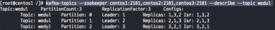 kafka-topics --zookeeper centos1:2181,centos2:2181,centos3:2181 --create --topic wedul --partitions 3 --replication-factor 3