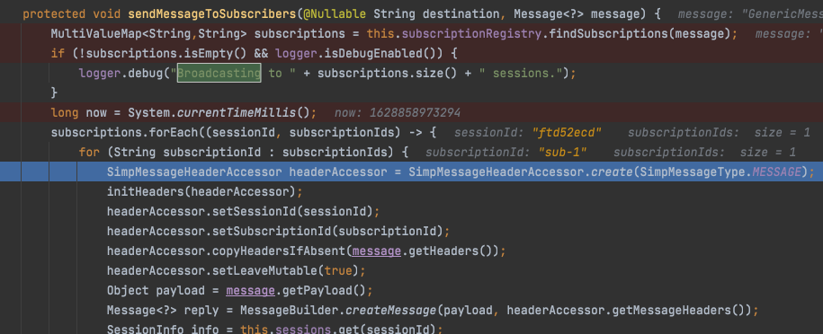 이렇게 전달된 메시지는 최종적으로 SimpleBrokerMessageHandler에 sendMessageToSubscribers를 통해 해당 endpoint subscription을 보유하고 있는 세션들에게 전달된다.