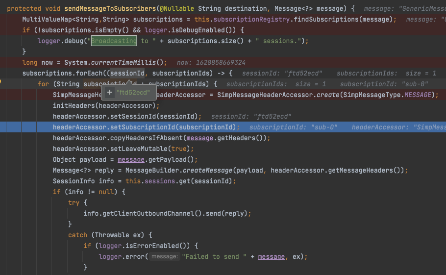 2021-08-13 21:44:28.349 DEBUG 23387 [clientInboundChannel-36] --- o.s.m.s.b.SimpleBrokerMessageHandler : Broadcasting to 2 sessions.