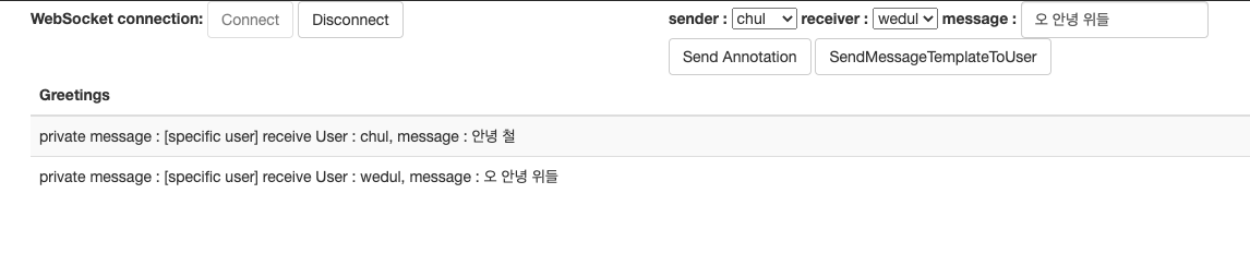 chul과 wedul 두 명의 사용자가 같은 endpoint를 subscribe하고 있었으나 실제로 wedul 사용자에게만 메시지가 잘 전달된것을 확인할 수 있다.