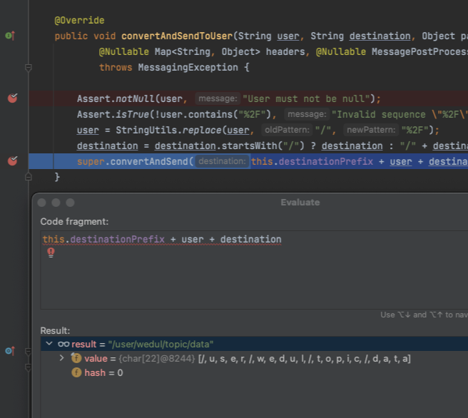 이때 호출되는 convertAndSendUser 파라미터로는 targetUserName, 브로커 채널 destination주소, payload 순서로 전송된다. 우리로 따지면 wedul 유저에게 전송할 시 "wedul", "/topic/data", payload 순서이다.