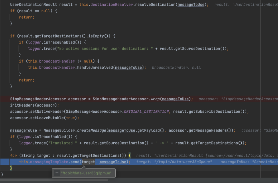 그리고 이렇게 메시지가 messagingTemplate를 통해서 서버에서 전송 시 UserDestinationMessageHandler를 통해서 /user/{username}/endpoint의 형태로 변경하게 되는데 우리 예시로 따지면 wedul user에게 메시지를 전송한다고 가정했을 때 /user/wedul/topic/data로 변형되어 전송된다. 이를 통해서 별도의 그들의 이름이나 목적지를 알 필요없이 메시지가 사용자에게 잘 전달될 수 있게 해준다.