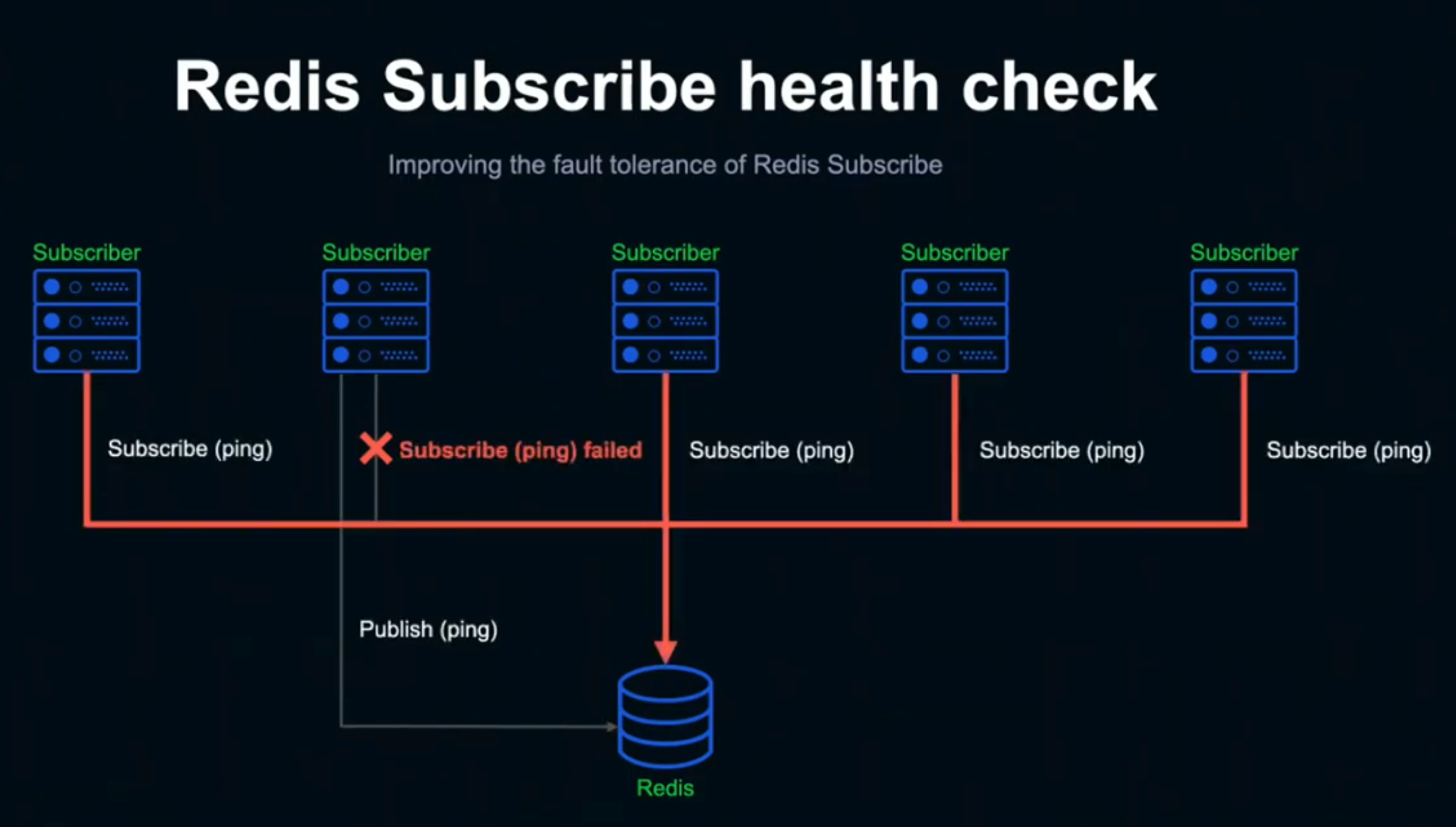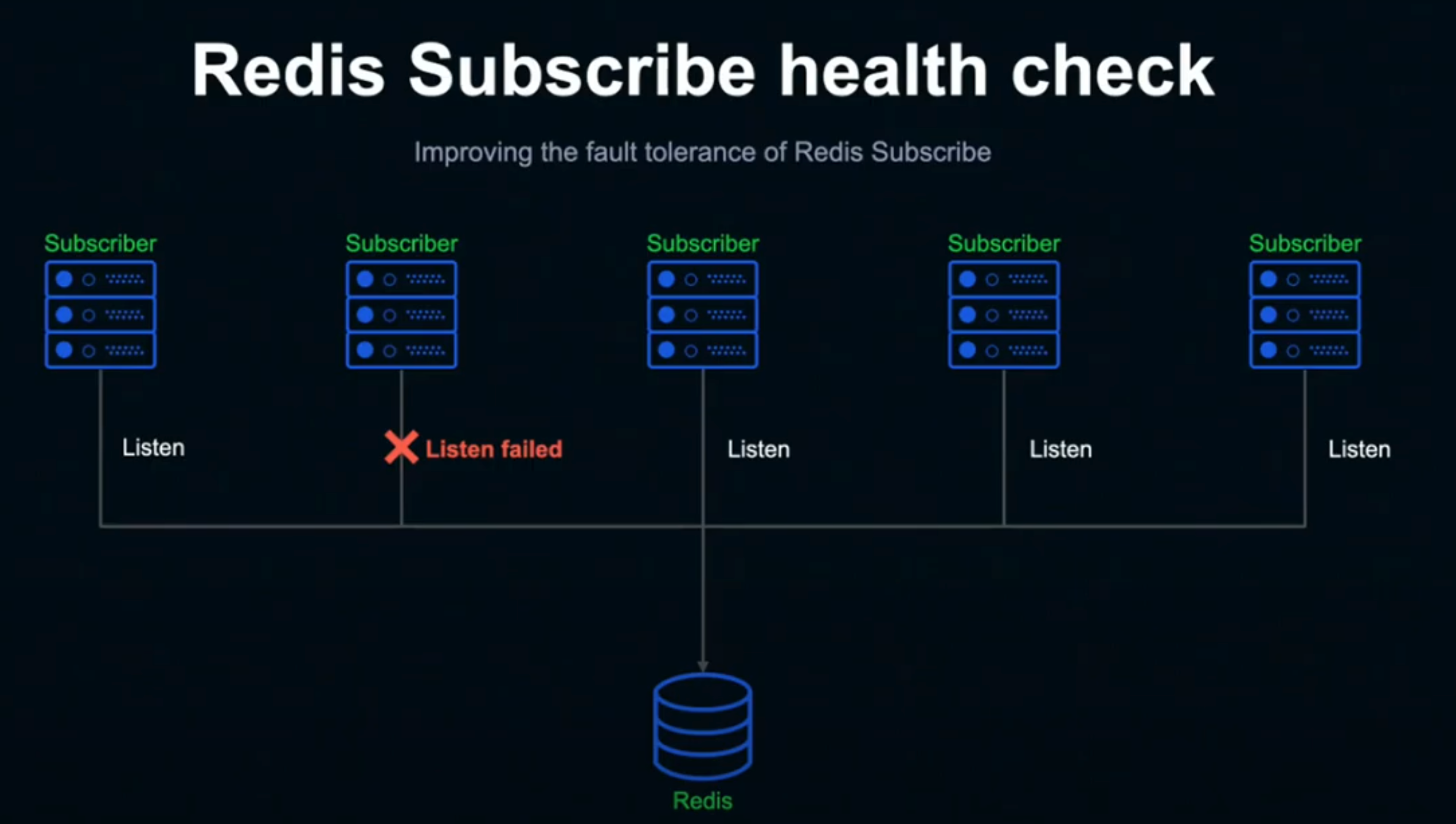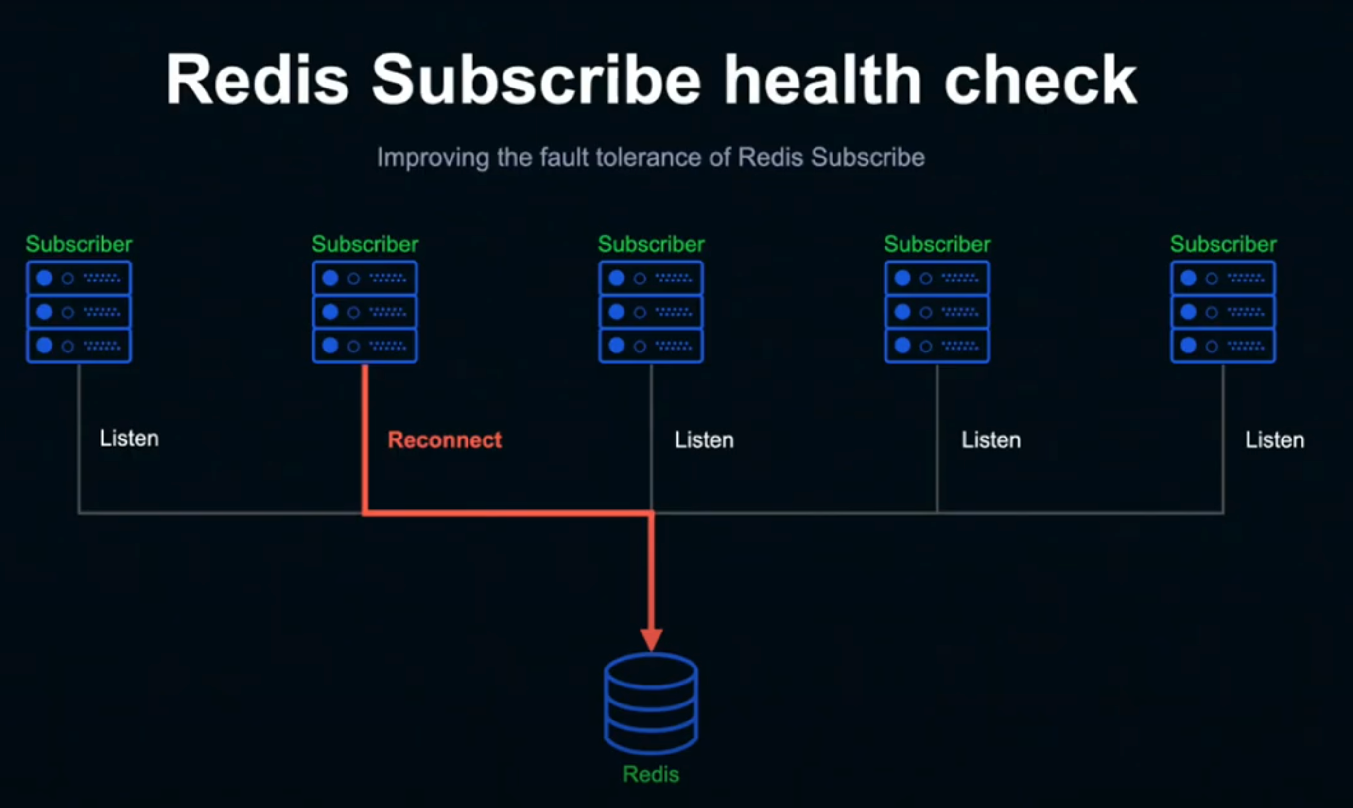 - 망가진 subscriber는 일정시간동안 subscriber를 하지못하기 때문에 redis서버로 publish (ping)을 주기적으로 보내고 ping정보를 수신하지 못했을 경우에는 내 서버가 정상적으로 subscribe 하지못하는구나라고 판단하고 reconnect를 하도록 설계하였다.