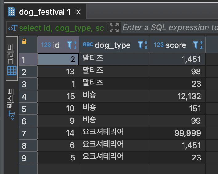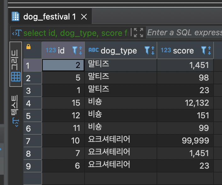 subquery에 나온 결과에서 나온 dog_type_rank의 순위중 3등까지만 나오도록 where 조건을 걸어준다. 이렇게 하면 각 타입별 스코어 랭킹 top n건을 뽑을 수 있다.