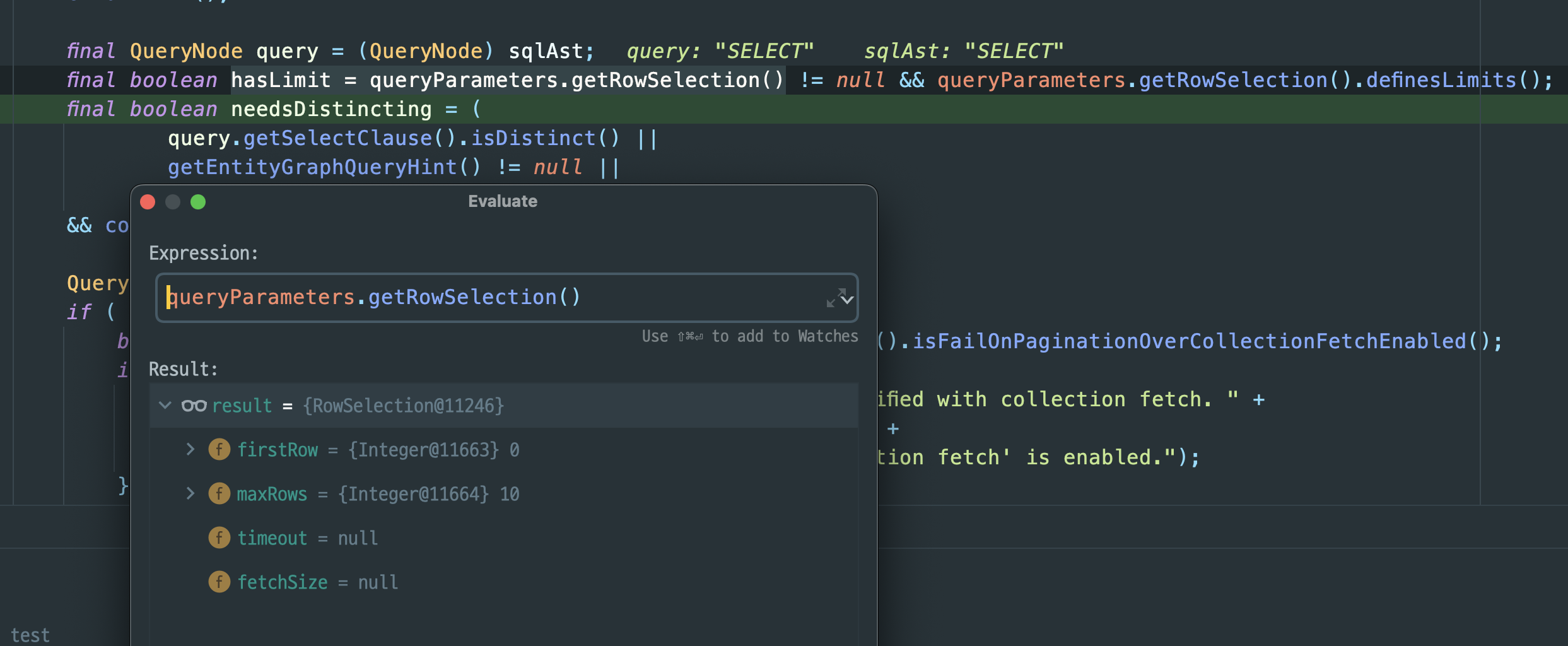 그 이유는 쿼리를 실행하고 결과를 가져오는 hibernate 코드를 살펴보면 알수있다. QueryTranslatorImpl에 보면 limit이 주어진 쿼리인지 보고 주어진 쿼리일 경우면서 collectionFetches 쿼리일경우에 아래처럼 distinct가 필요한 쿼리로서 판단하게 된다.