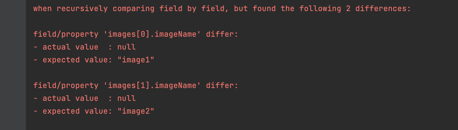 하지만 collection을 사용하는 경우 collection 내부의 값의 이름이 다를경우에는 다르게 해결해줘야한다. 예를 들어 AccountEntity에서 AccountResponse로 값을 매핑한다고 가정하였을 때 내부에 images라는 응답값도 매핑한다고 가정해보자. 아래 처럼 AccountImageResponse와 AccountImageEntity 내부에 필드이름이 서로 다를경우 매핑이 정상적으로 되지 않는다. 아래 코드를 살펴보자.