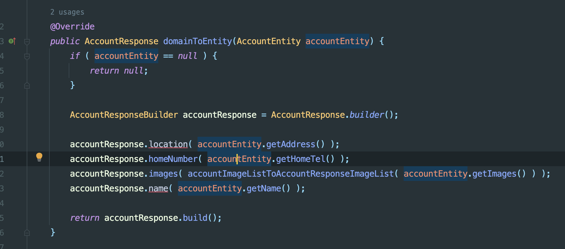 위와 같이 AccountEntity에서 AccountResponse로 값을 매핑하고 싶어서 Mapper를 선언했을 때 Annotation processor를 통해 생성된 코드는 아래와 같이 setter를 사용해서 객체를 생성하고 값을 넣어준다.