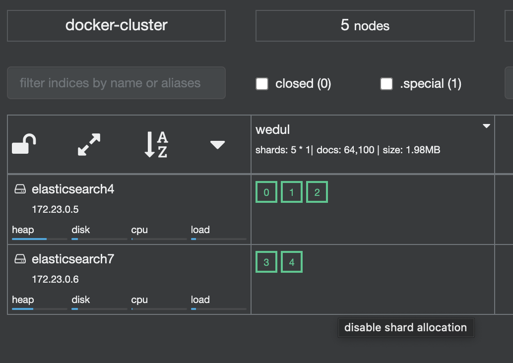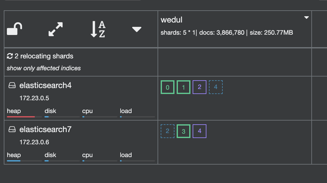모든 primary shard가 elasticsearch4노드에 모여있으서 이것을 elasitcsearch5, elasitcsearch6 node에 옮겨보겠다.