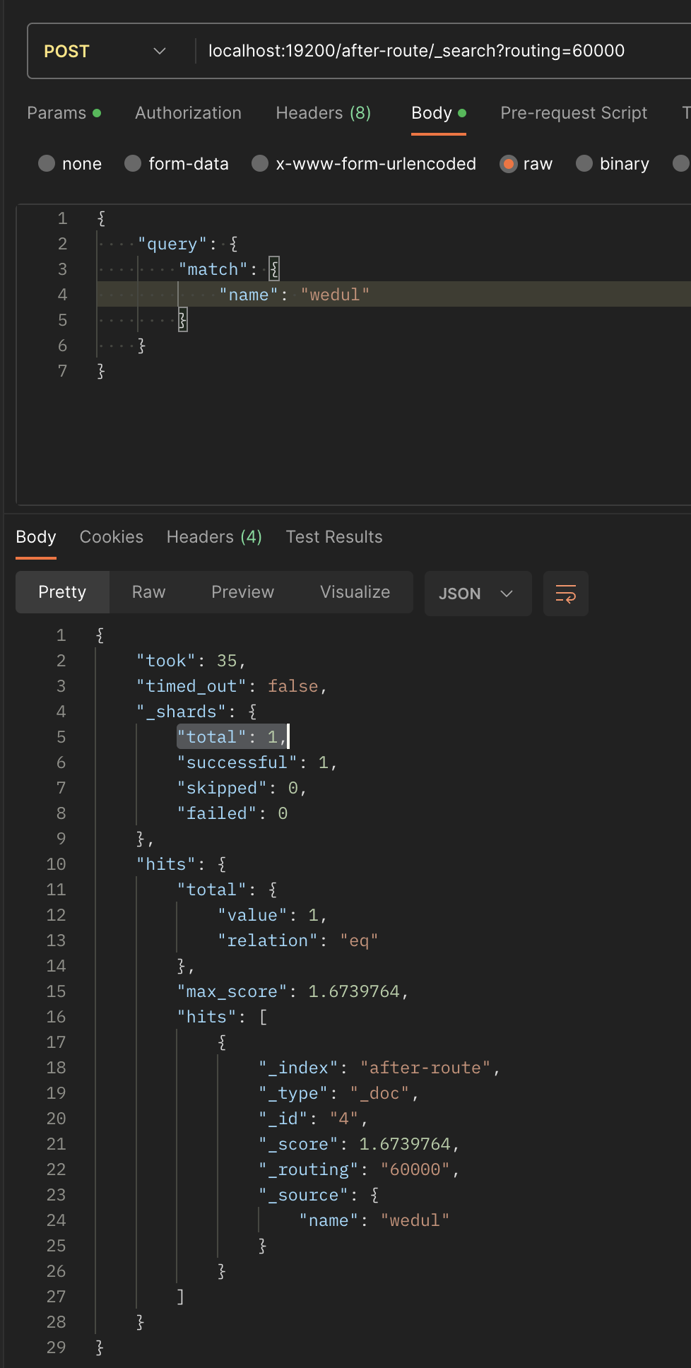 그럼 다음으로 실제로 routing을 넣어서 조회하면 하나의 shard에서만 조회가 발생하는지 확인해보면 아래 같은 쿼리에서 routing만 붙여서 조회해도 shard가 1개에서 조회가 이뤄진거를 확인할 수 있다.