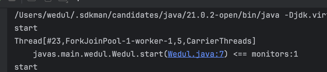 이때 두개의 virtual thread가 Wedul.start()를 실행시킨다고 가정해보면 synchronized가 pinning을 발생시키는지 확이할 수 있다.