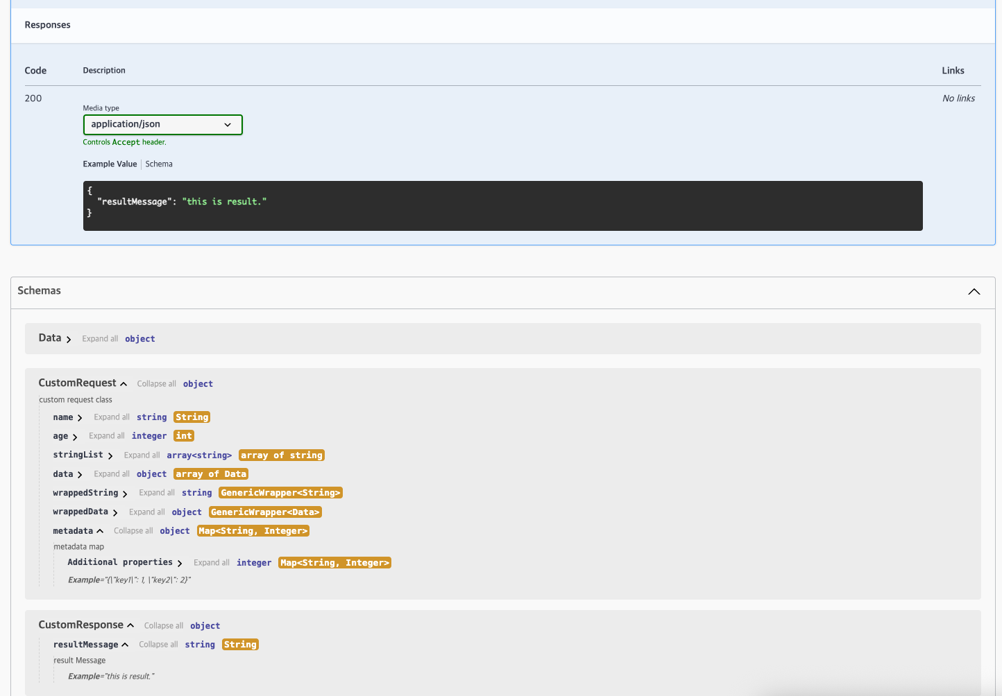 -> RequestBody, ApiResponse 클래스 내부에 정의된 filed들에 대해서 schema를 만드는 로직이다. 이 로직을 통해서 ParameterizedType의 경우 collection과 제네릭에 대한 처리를 진행 할 수 있다. 그리고 그 이외 Primitive type에 대한 처리와 추가 처리 되지 못한건 string schema 처리를 진행했다.